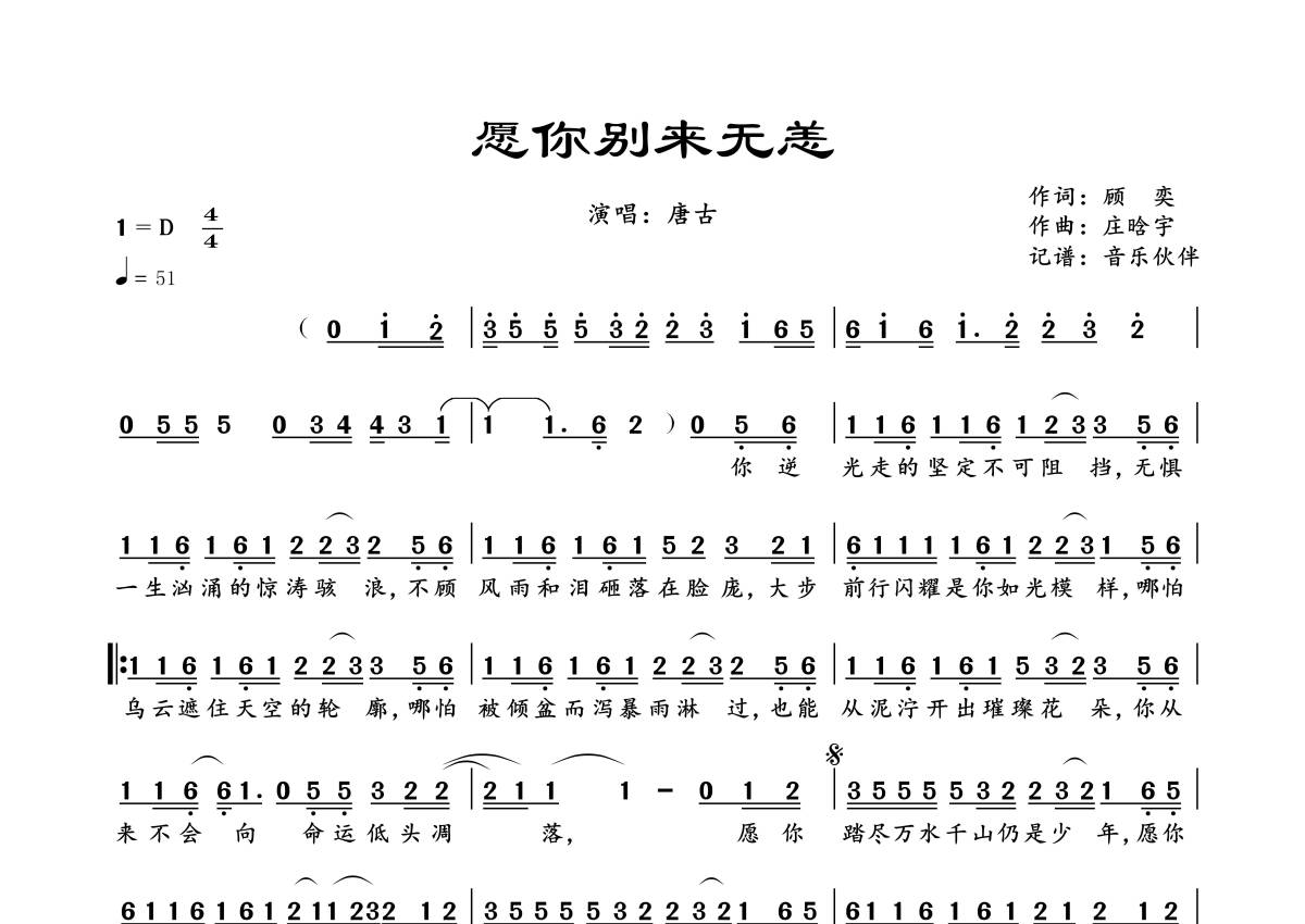 曲谱介绍: 唐古《愿你别来无恙》,音乐伙伴编配出品,共有1张高清图谱,免翻页排版设计。