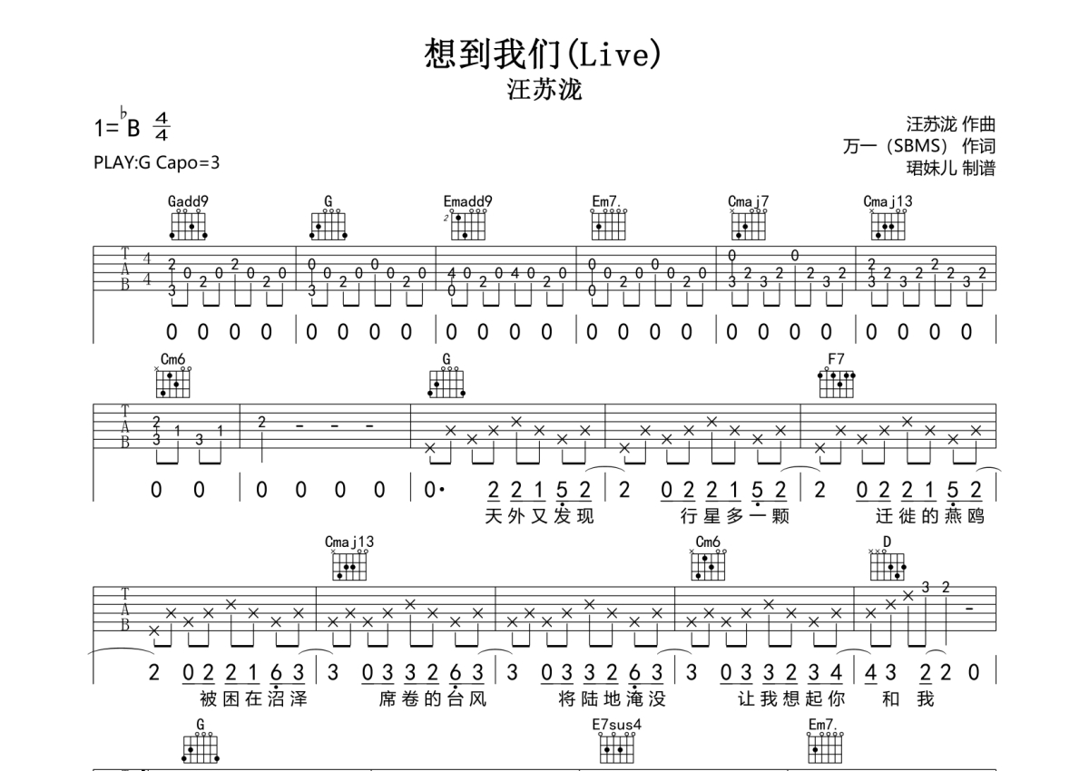 曲谱介绍: 汪苏泷《想到我们》吉他弹唱谱,采用G调指法编配live,珺妹儿编配出品,共有3张高清图谱。