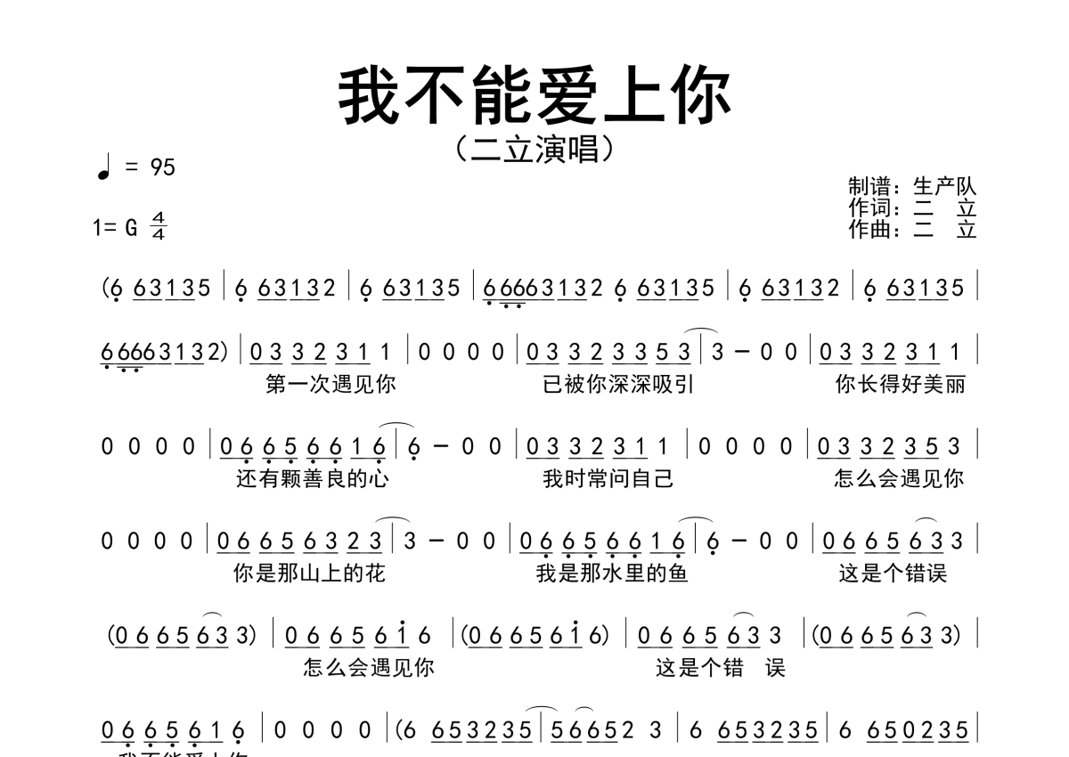 曲谱介绍: 二立《我不能爱上你》原版简谱,生产队编配出品,共有1张高清图谱,免翻页排版设计。