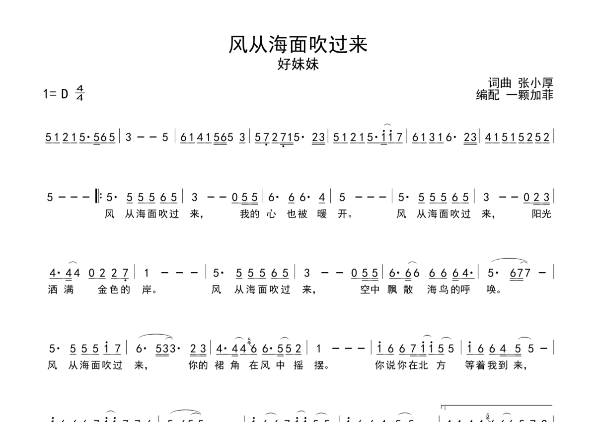 曲谱介绍: 好妹妹《风从海面吹过来》,一颗加菲编配出品,共有1张高清图谱,免翻页排版设计。