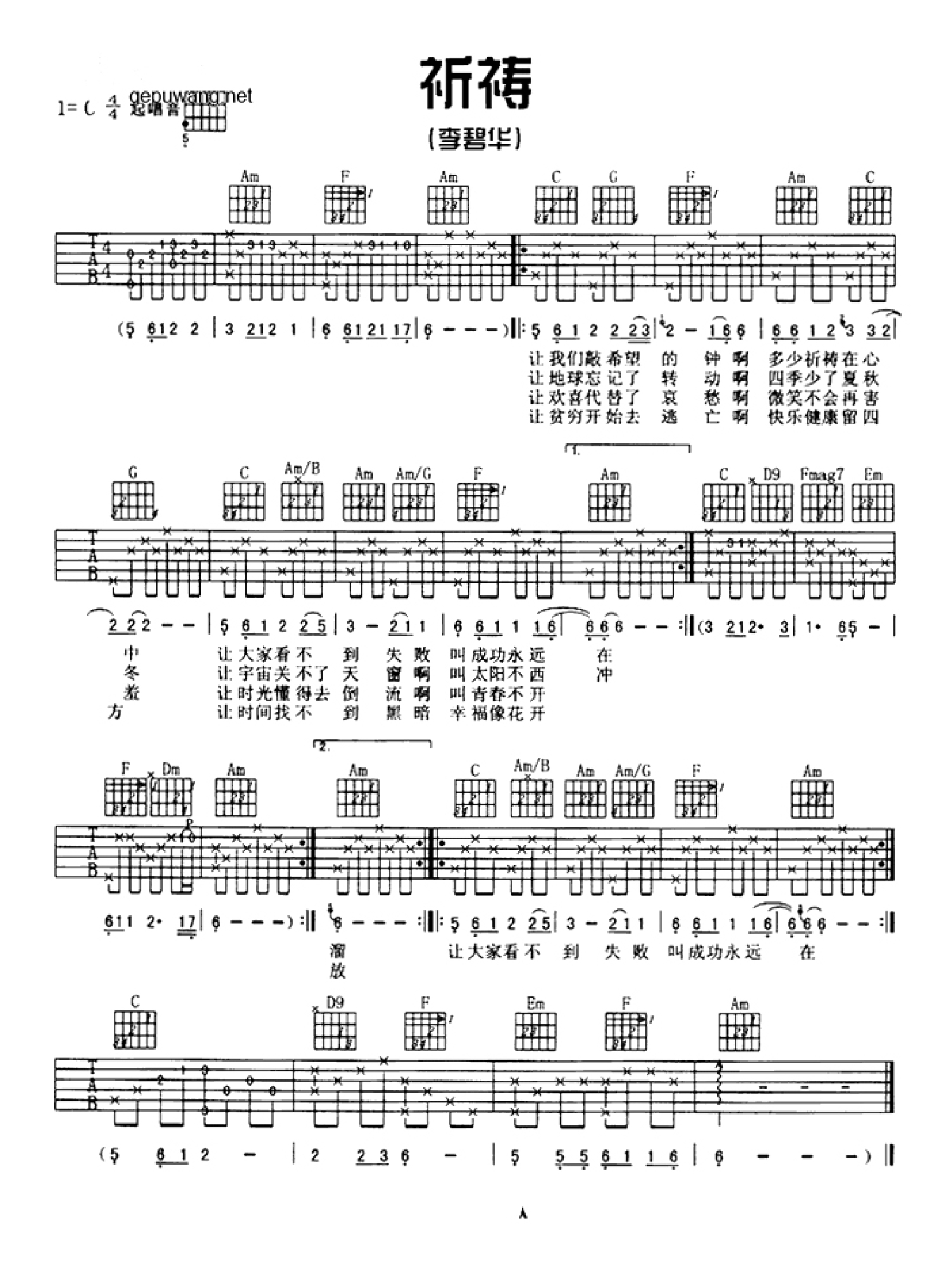 曲谱介绍: 王杰《祈祷》吉他谱_C调吉他弹唱谱