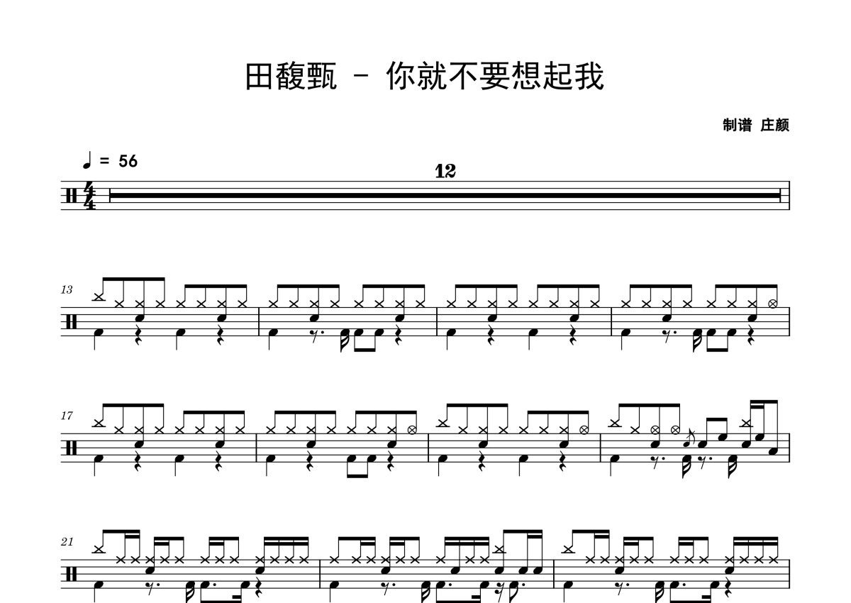 曲谱介绍: 田馥甄《你就不要想起我》架子鼓谱,庄颜编配出品,共有2张高清图谱,免翻页排版设计。