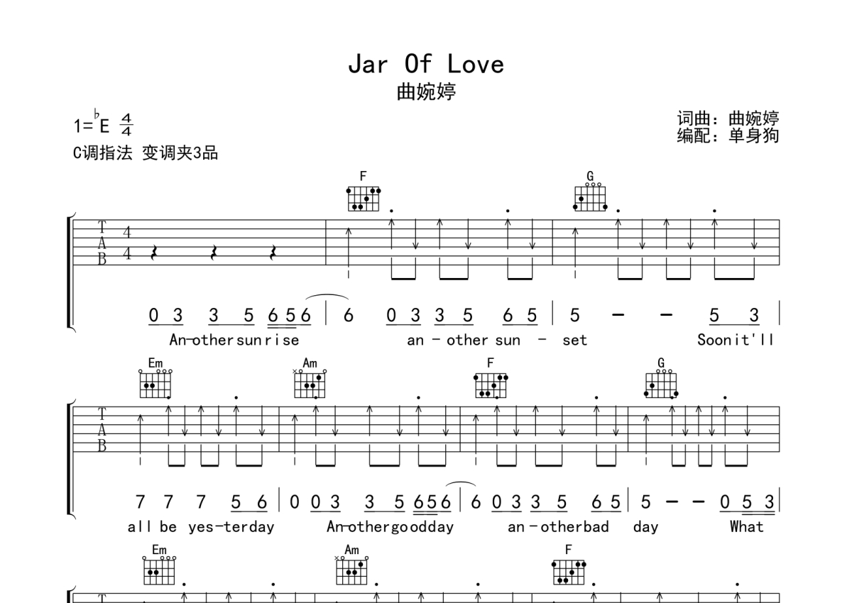 曲谱介绍: 曲婉婷《JarOfLove》吉他弹唱谱,采用C调指法编配,单身狗编配出品,共有6张高清图谱。