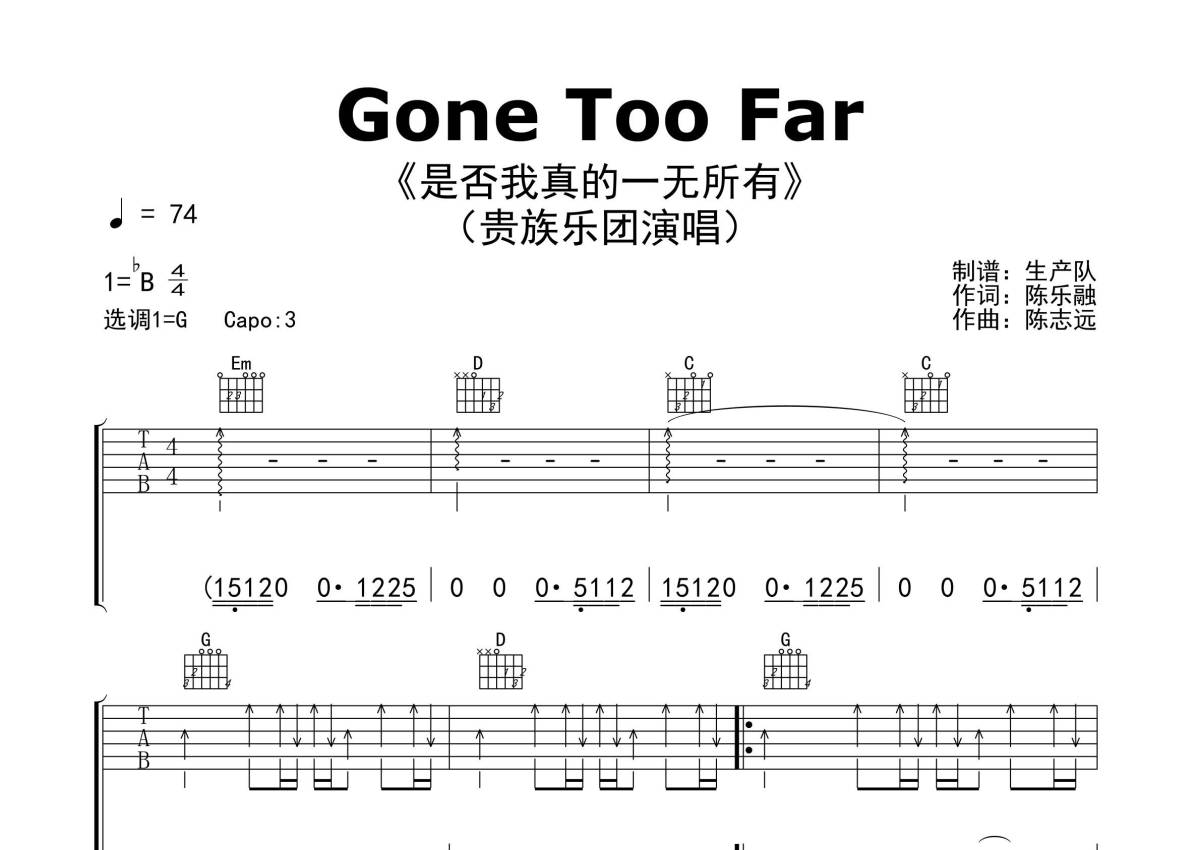 曲谱介绍: 是否我真的一无所有《GoneTooFar(是否我真的一无所有)》吉他弹唱谱,采用G调指法编配精编完美版,生产队编配出品,共有3张高清图谱。