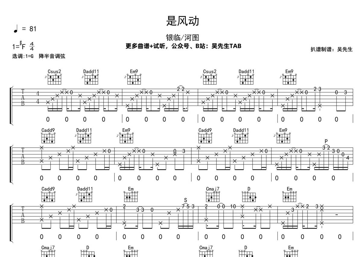 曲谱介绍: 银临/河图《是风动》吉他弹唱谱,采用G调指法编配,吴先生TAB编配出品,共有3张高清图谱。
