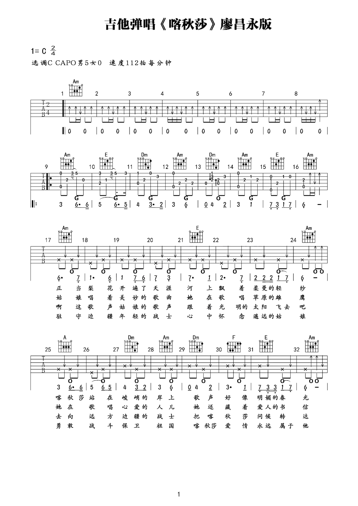 曲谱介绍: 廖昌永《喀秋莎》吉他谱_C调吉他弹唱谱