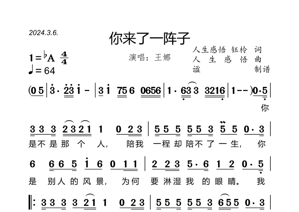 曲谱介绍: 王娜《你来了一阵子》,谧编配出品,共有2张高清图谱,免翻页排版设计。