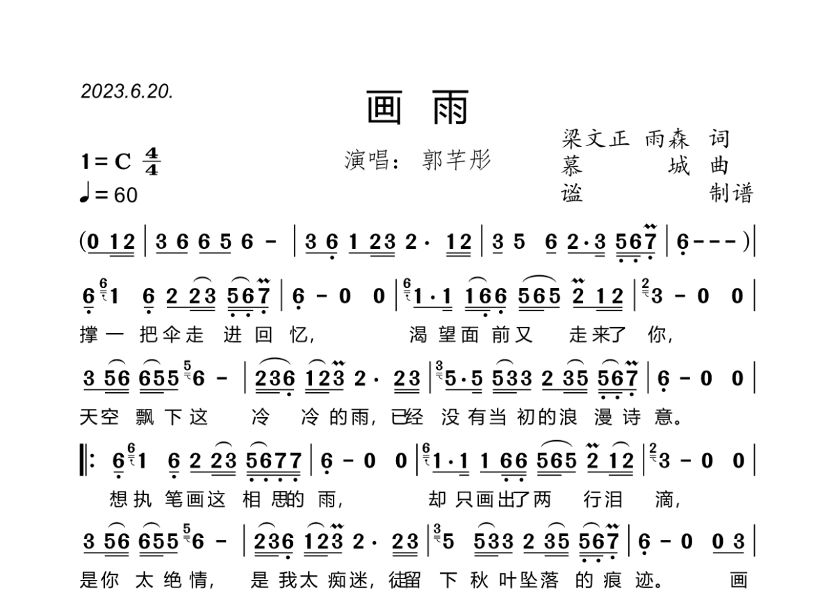 曲谱介绍: 郭芊彤《画雨》,谧编配出品,共有1张高清图谱,免翻页排版设计。