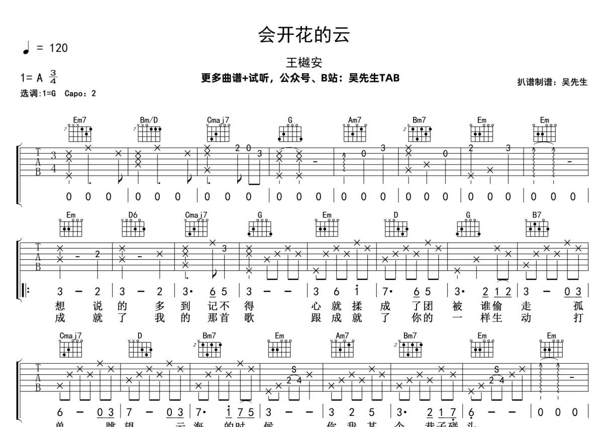 曲谱介绍: 王樾安《会开花的云》吉他弹唱谱,采用G调指法编配,吴先生TAB编配出品,共有2张高清图谱,免翻页排版设计。