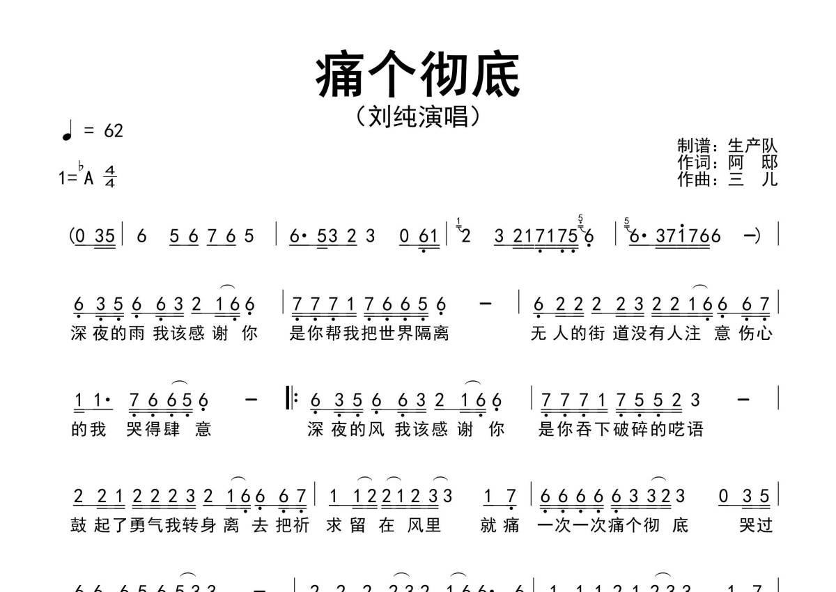 曲谱介绍: 刘纯《痛个彻底》原版简谱,生产队编配出品,共有1张高清图谱,免翻页排版设计。