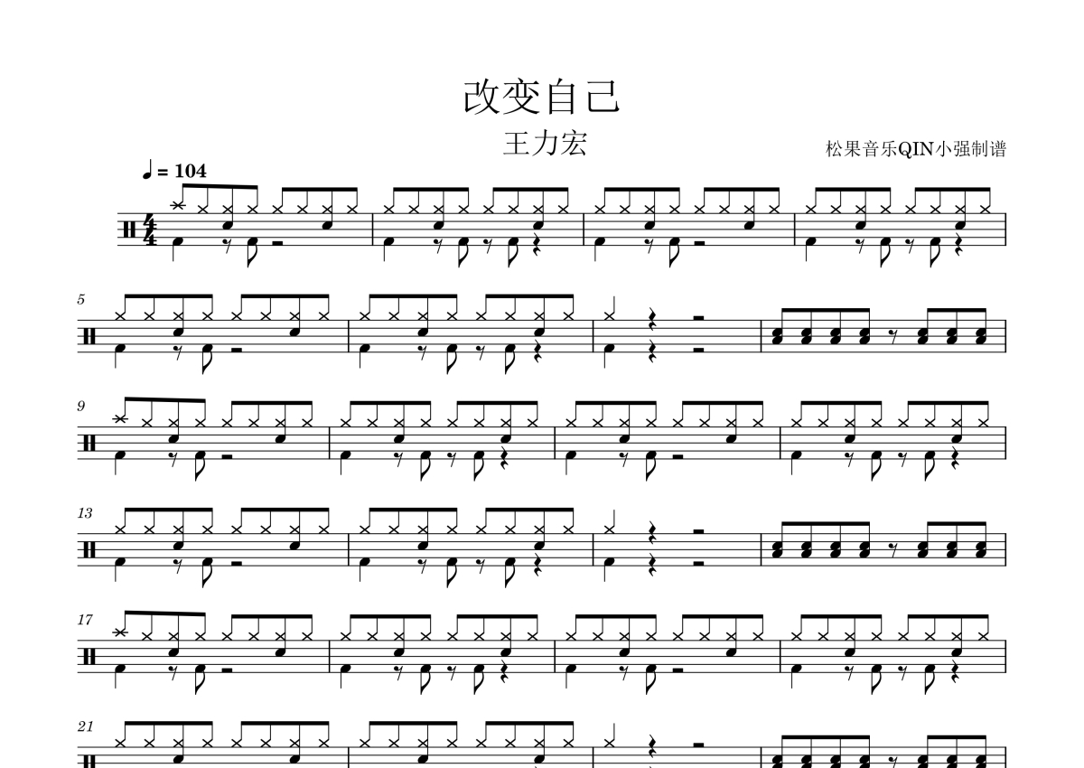 曲谱介绍: 王力宏《改变自己》架子鼓谱,松果音乐QIN小强编配出品,共有2张高清图谱,免翻页排版设计。
