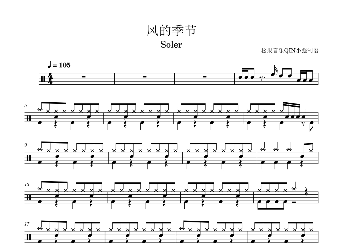 曲谱介绍: Soler《风的季节》架子鼓谱,松果音乐QIN小强编配出品,共有3张高清图谱。