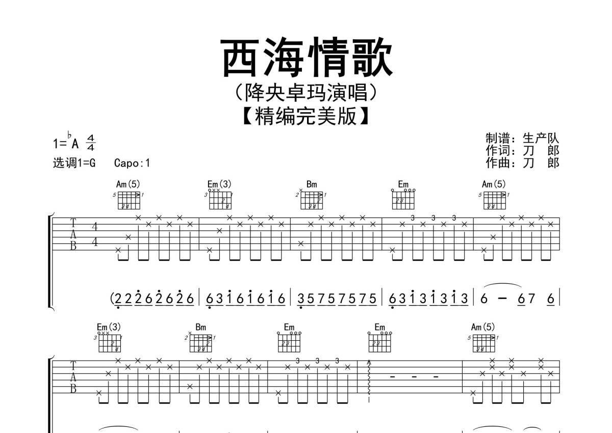 曲谱介绍: 降央卓玛《西海情歌》吉他弹唱谱,采用G调指法编配精编完美版,生产队编配出品,共有3张高清图谱。