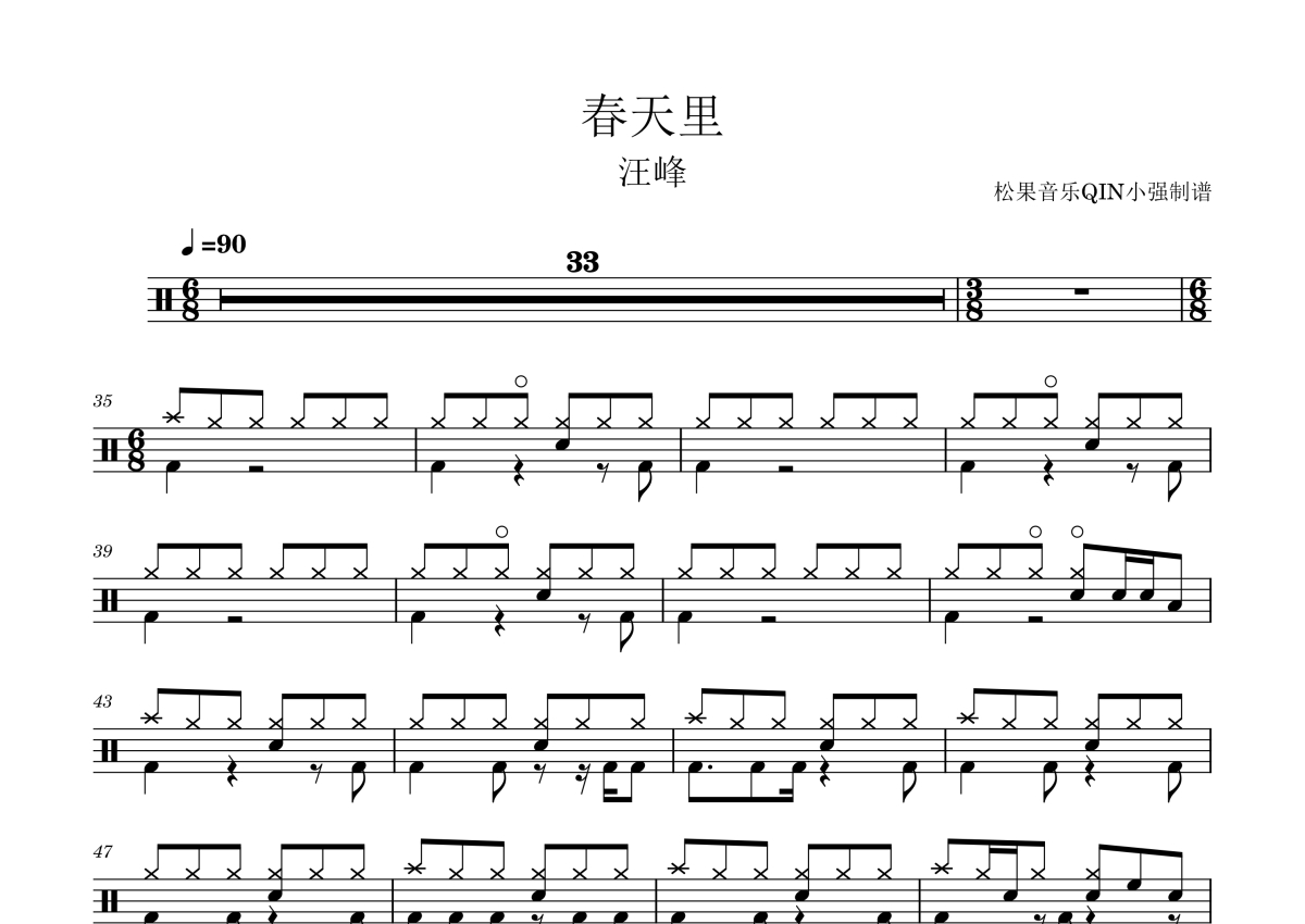 曲谱介绍: 汪峰《春天里》架子鼓谱,松果音乐QIN小强编配出品,共有3张高清图谱。