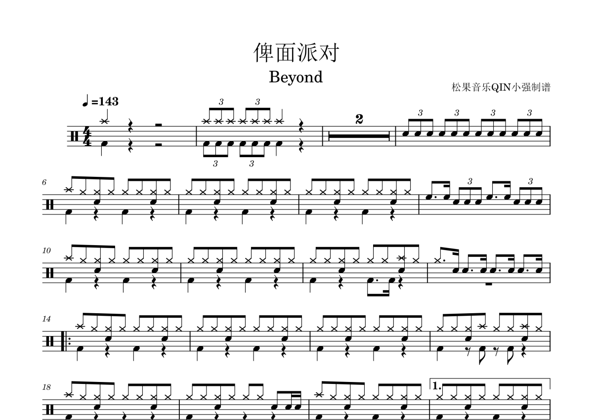 曲谱介绍: Beyond《俾面派对》架子鼓谱,松果音乐QIN小强编配出品,共有2张高清图谱,免翻页排版设计。
