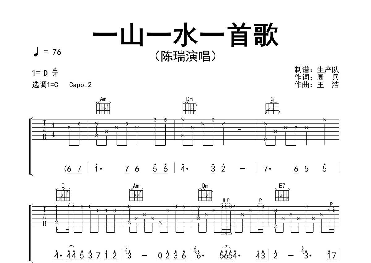 曲谱介绍: 陈瑞《一山一水一首歌》吉他弹唱谱,采用C调指法编配精编完美版,生产队编配出品,共有3张高清图谱。