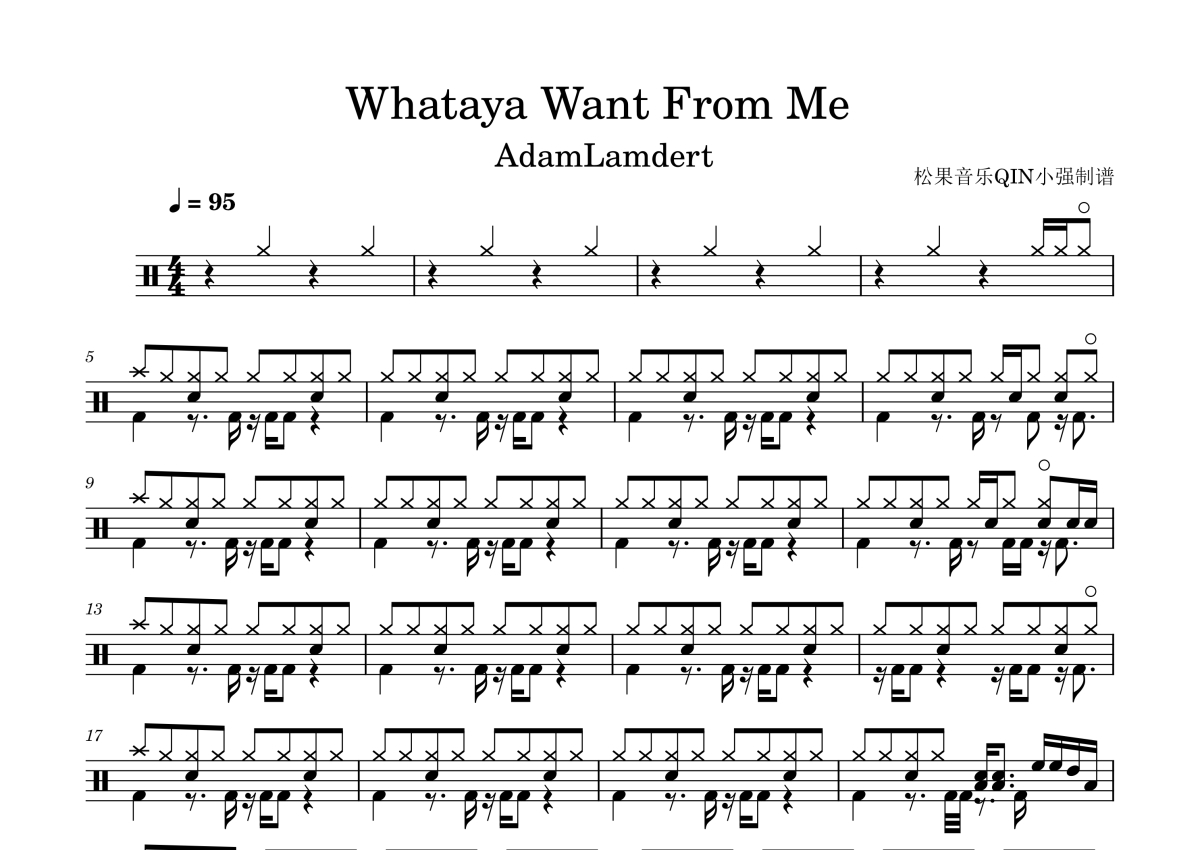 曲谱介绍: AdamLambert《WhatayaWantFromMe》架子鼓谱,松果音乐QIN小强编配出品,共有3张高清图谱。