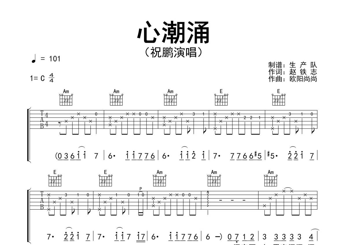 曲谱介绍: 祝鹏《心潮涌》吉他弹唱谱,采用C调指法编配精编完美版,生产队编配出品,共有3张高清图谱。