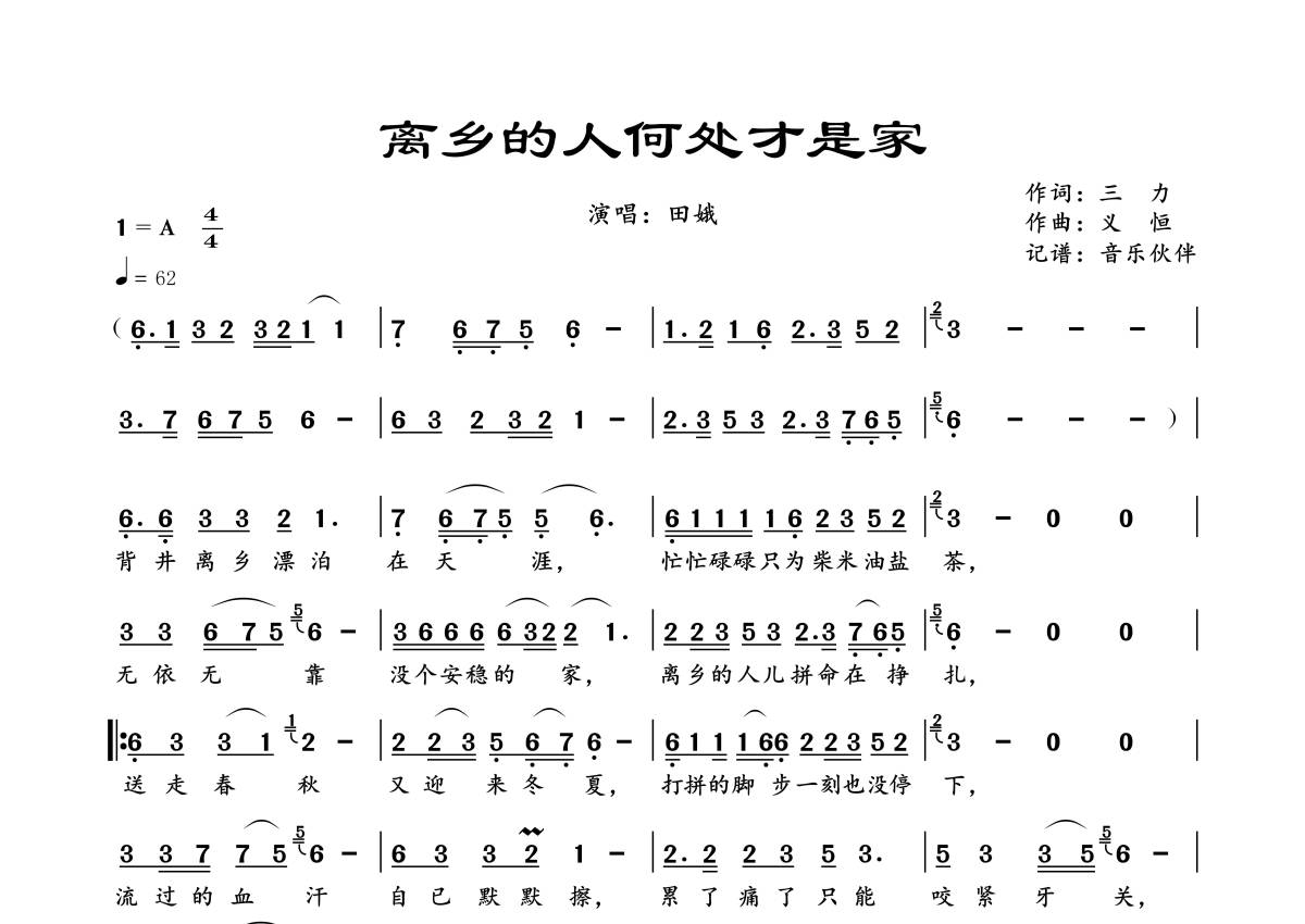 曲谱介绍: 田娥《离乡的人何处才是家》,音乐伙伴编配出品,共有1张高清图谱,免翻页排版设计。
