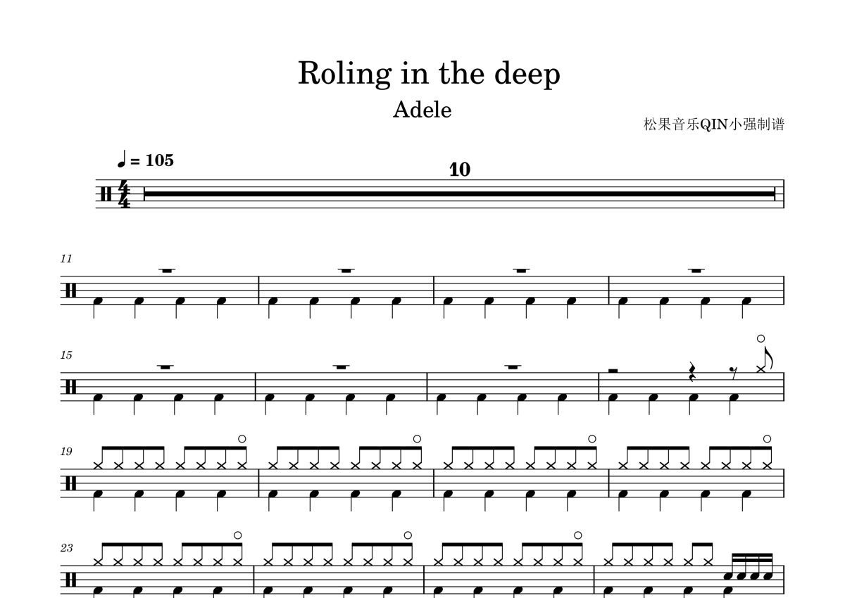 曲谱介绍: Adele《Rolinginthedeep》架子鼓谱,松果音乐QIN小强编配出品,共有3张高清图谱。