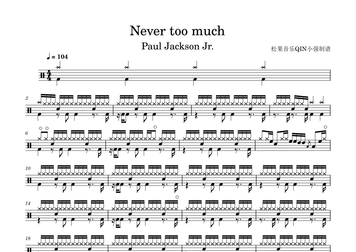 曲谱介绍: PaulJacksonJr《Nevertoomuch》架子鼓谱,松果音乐QIN小强编配出品,共有3张高清图谱。