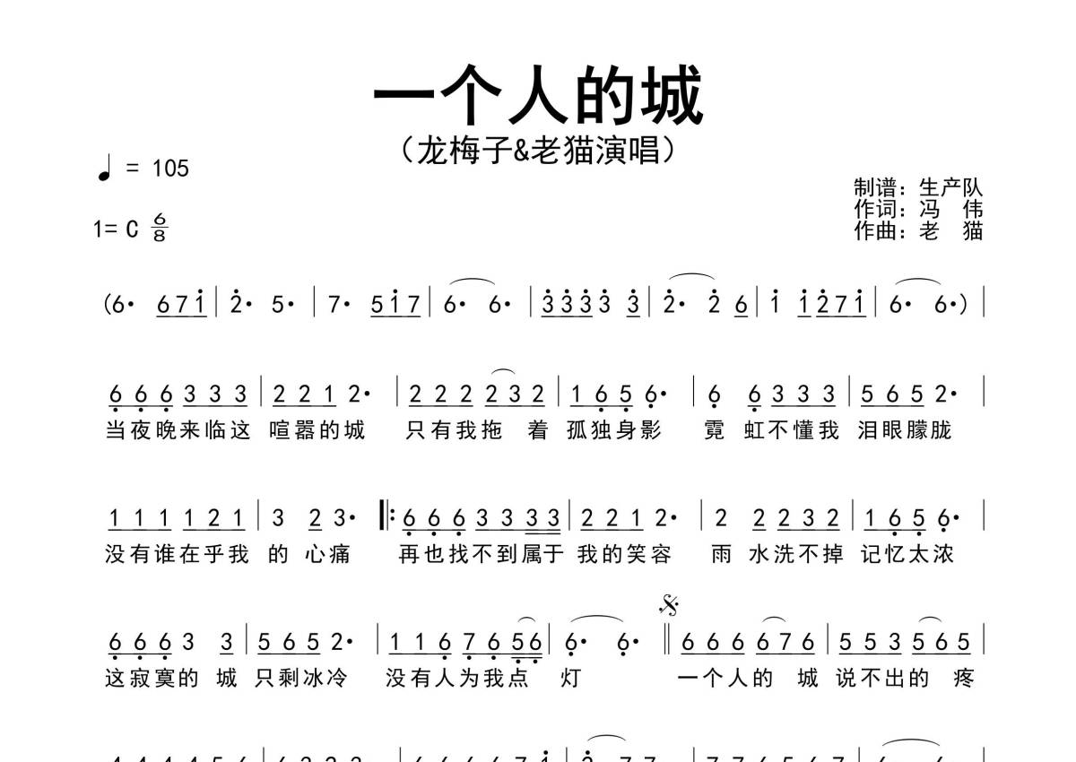 曲谱介绍: 龙梅子/老猫《一个人的城》原版简谱,生产队编配出品,共有1张高清图谱,免翻页排版设计。