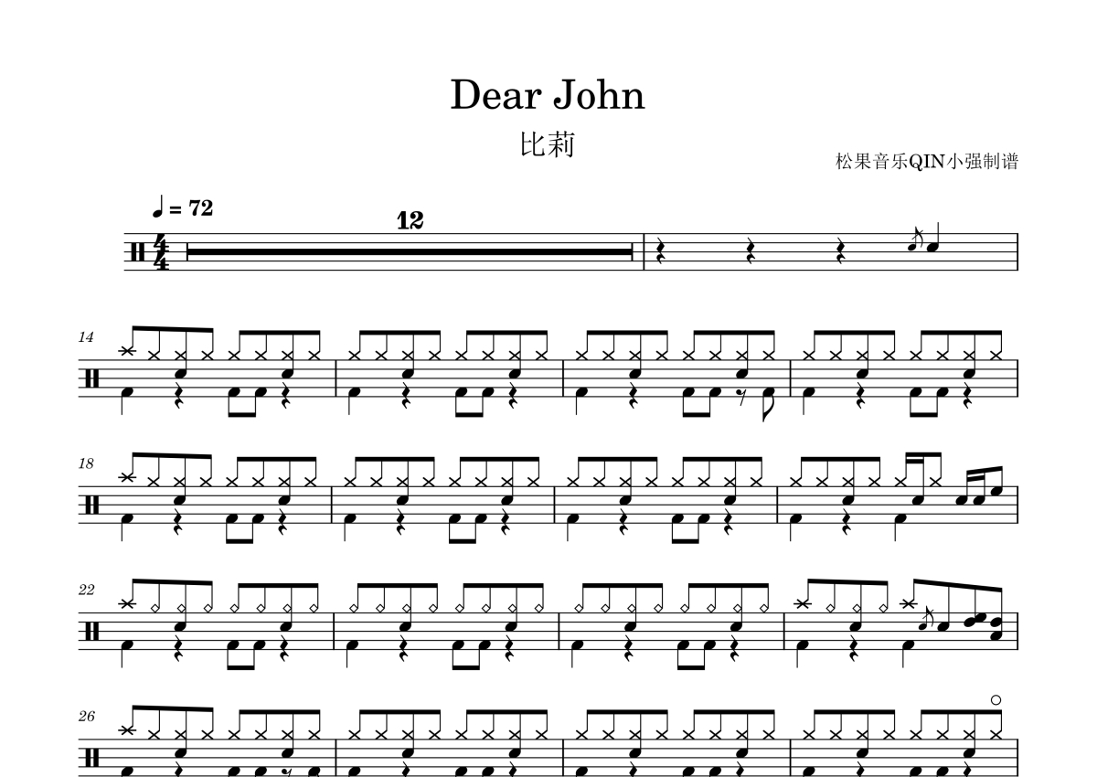 曲谱介绍: 比莉《DearJohn》架子鼓谱,松果音乐QIN小强编配出品,共有2张高清图谱,免翻页排版设计。