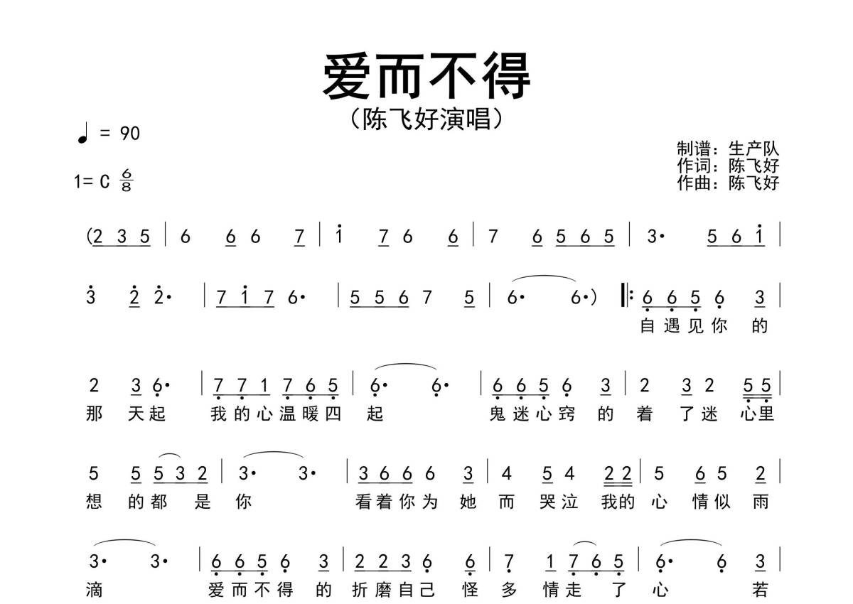 曲谱介绍: 陈飞好《爱而不得》原版简谱,生产队编配出品,共有1张高清图谱,免翻页排版设计。