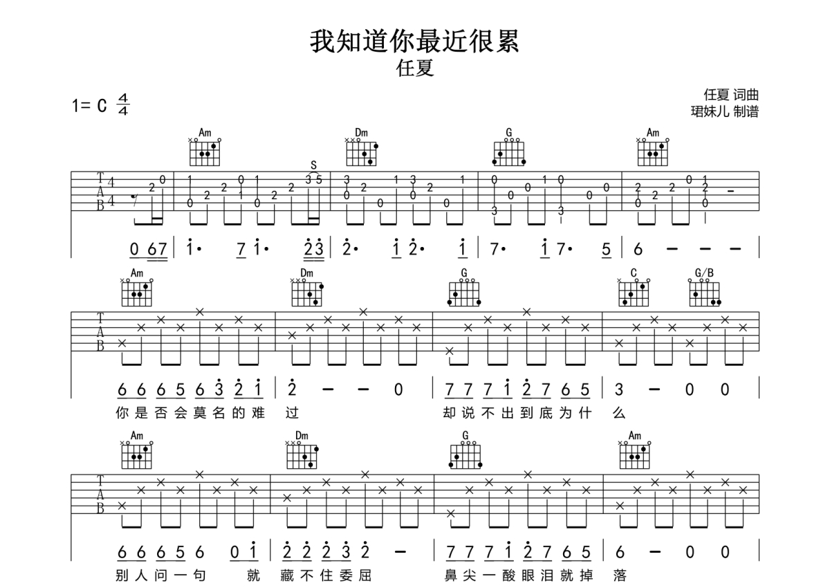 • 我知道你最近很累吉他谱 - 任夏 - C调吉他弹唱谱第1张