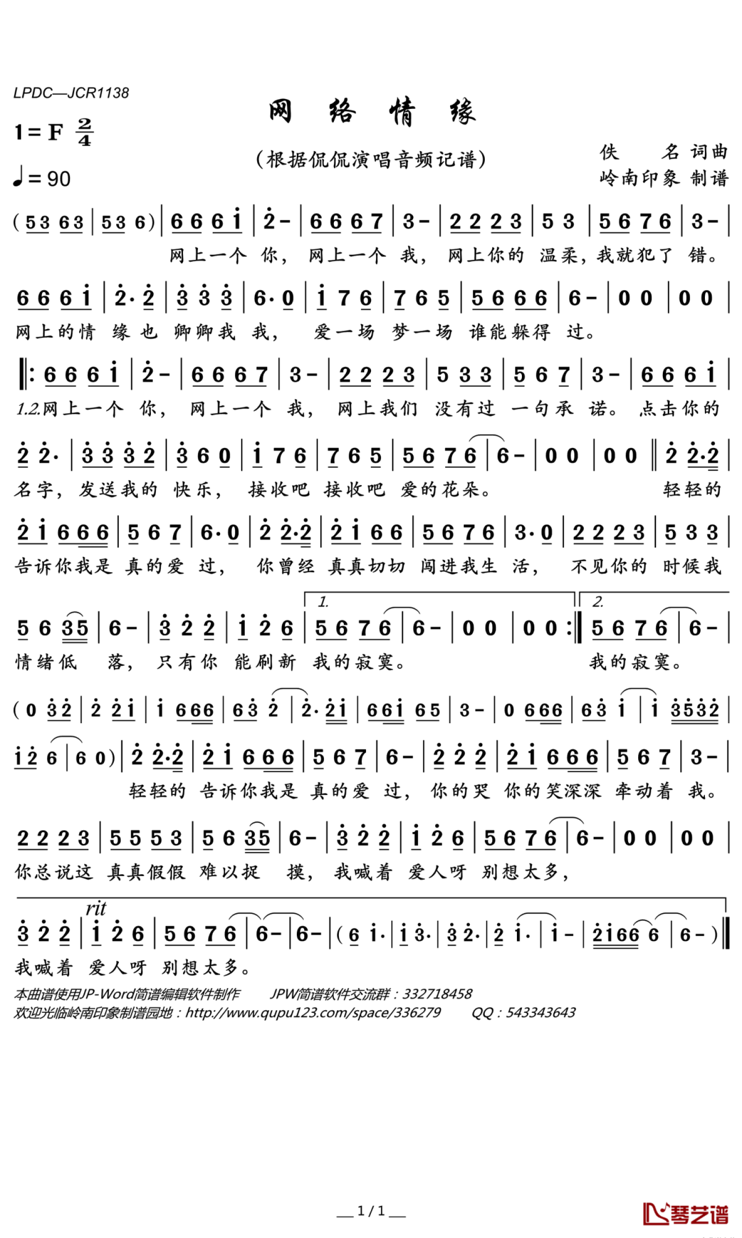 曲谱介绍: 侃侃《网络情缘》歌词_简谱