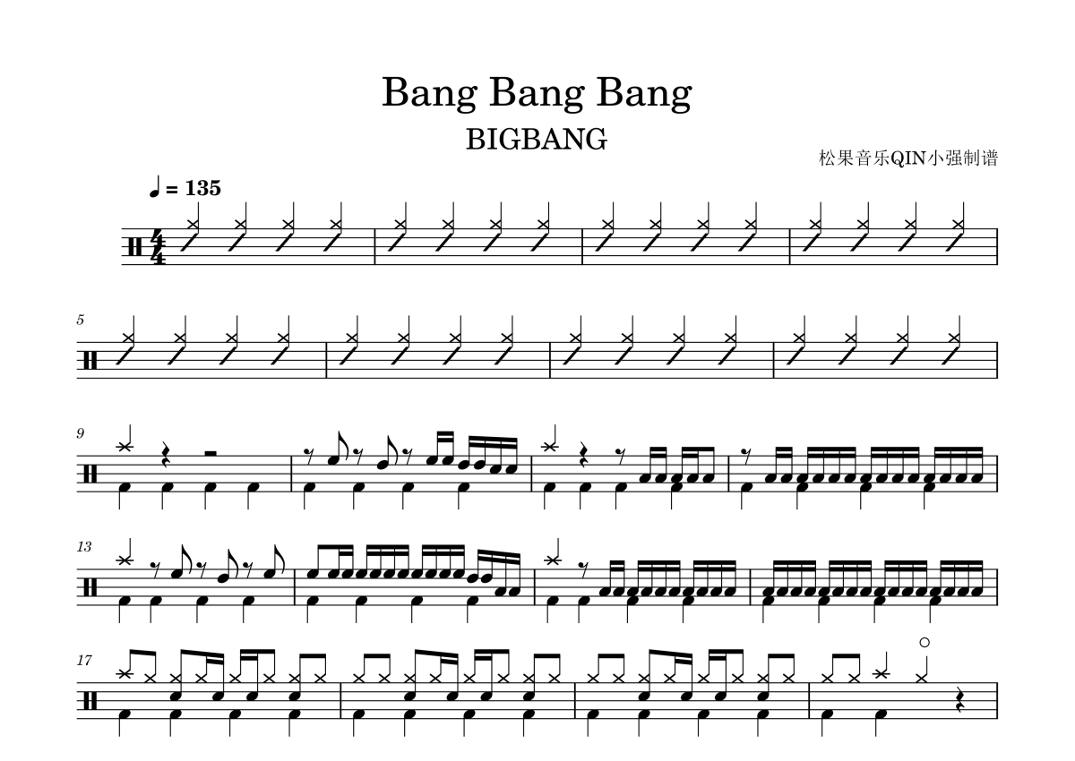 曲谱介绍: BIGBANG《BangBangBang》架子鼓谱,松果音乐QIN小强编配出品,共有3张高清图谱。