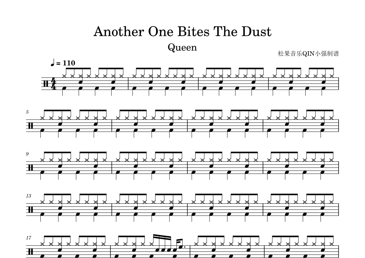 曲谱介绍: Queen(皇后乐队)《AnotherOneBitesTheDust》架子鼓谱,松果音乐QIN小强编配出品,共有3张高清图谱。