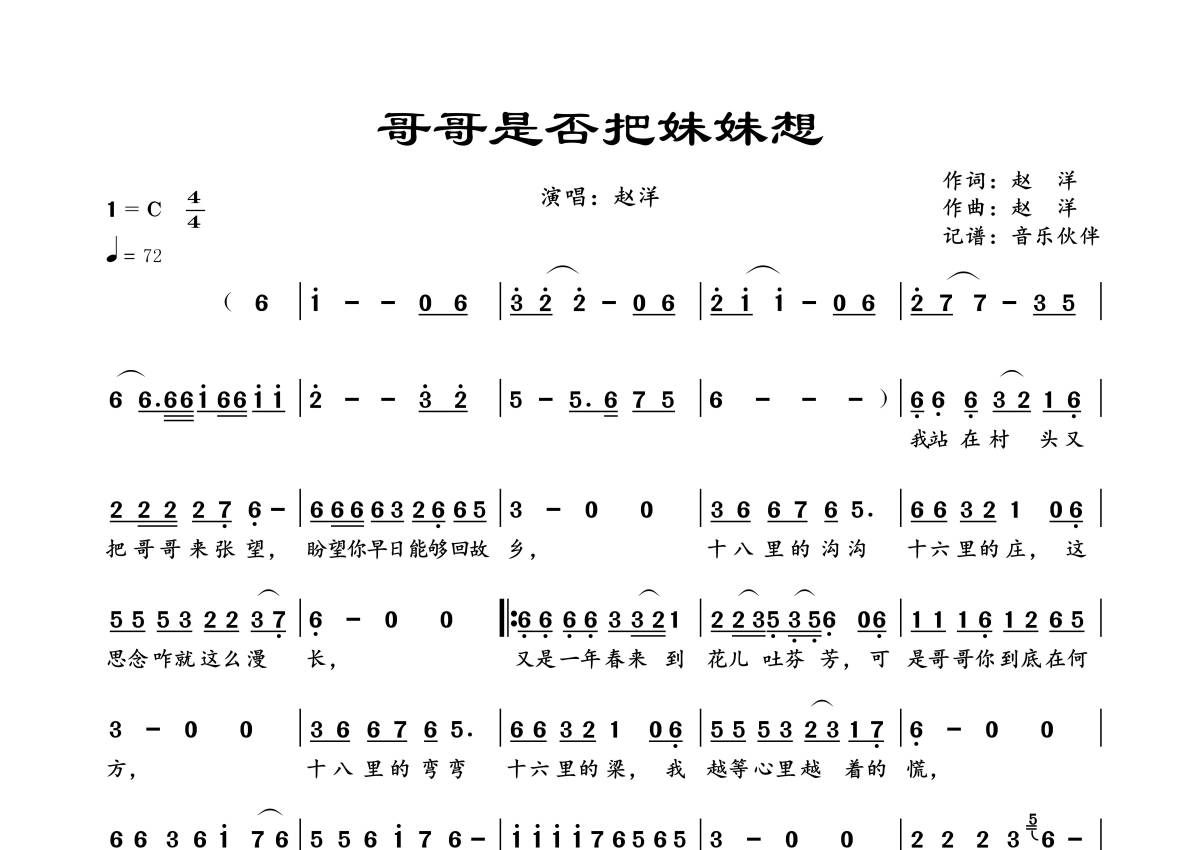 曲谱介绍: 赵洋《哥哥是否把妹妹想》,音乐伙伴编配出品,共有1张高清图谱,免翻页排版设计。