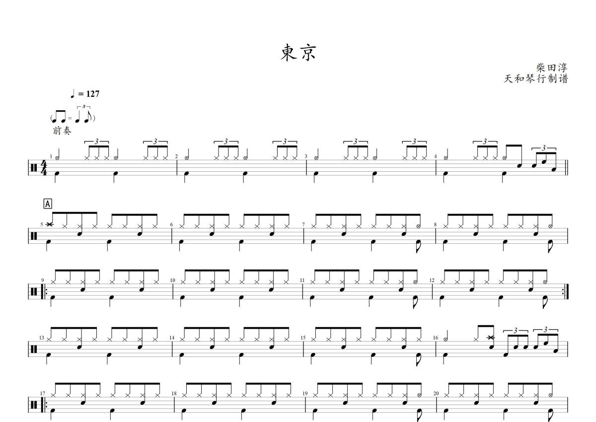 曲谱介绍: 柴田淳(しばたじゅん,ShibataJun)《东京》架子鼓谱,音符喷血者编配出品,共有2张高清图谱,免翻页排版设计。
