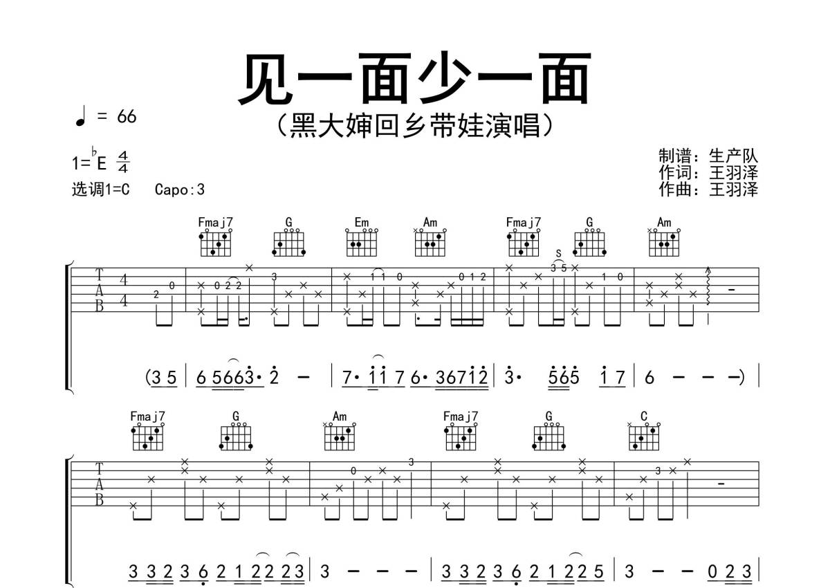 曲谱介绍: 黑大婶回乡带娃《见一面少一面》吉他弹唱谱,采用C调指法编配精编完美版,生产队编配出品,共有3张高清图谱。