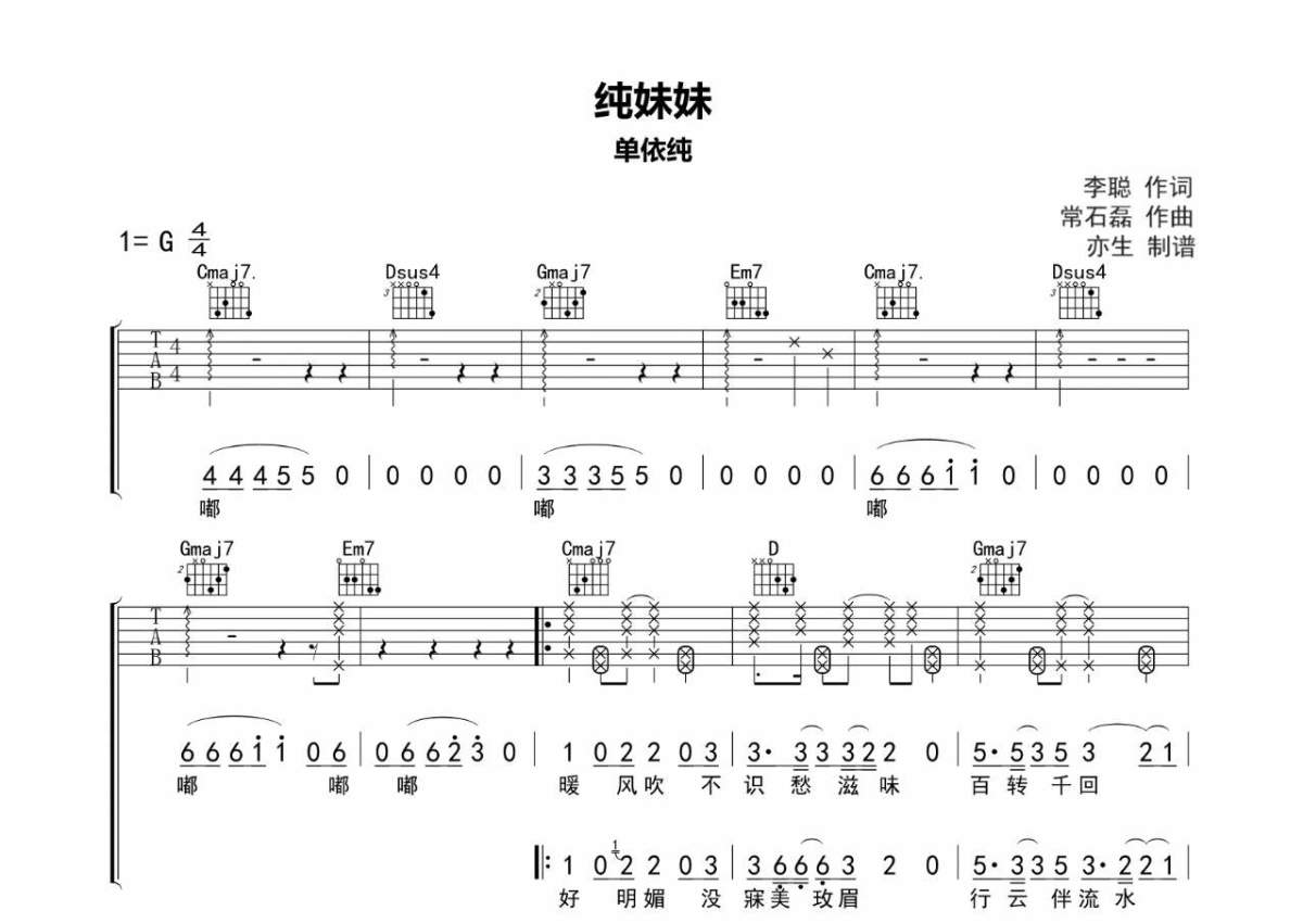 曲谱介绍: 单依纯《纯妹妹》吉他弹唱谱,采用G调指法编配,亦生编配出品,共有3张高清图谱。
