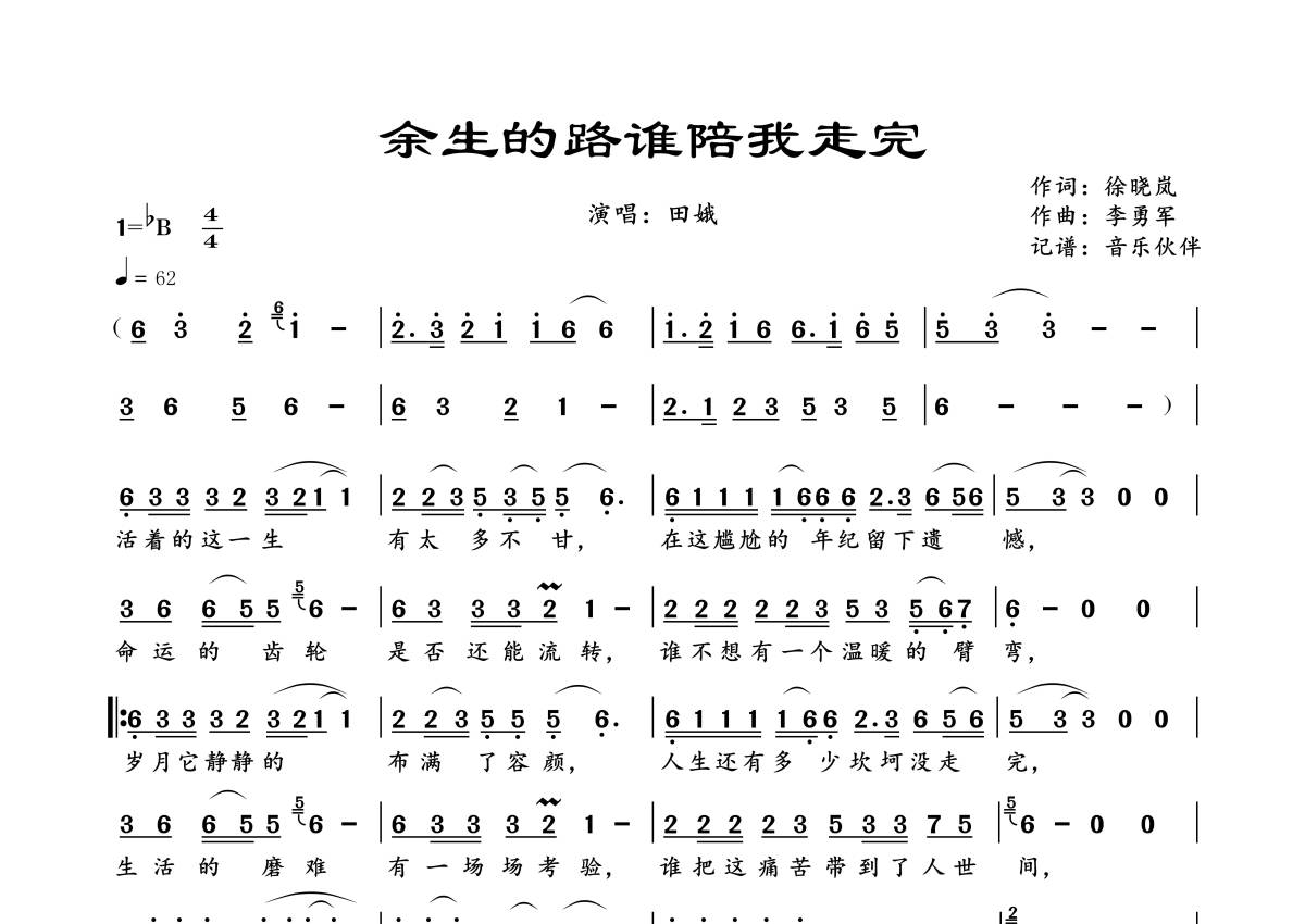 曲谱介绍: 田娥《余生的路谁陪我走完》,音乐伙伴编配出品,共有1张高清图谱,免翻页排版设计。