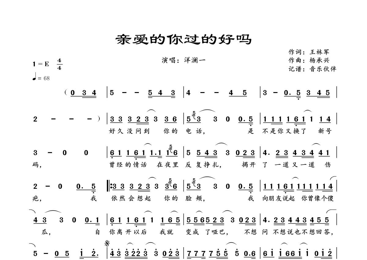 曲谱介绍: 洋澜一《亲爱的你过的好吗》,音乐伙伴编配出品,共有1张高清图谱,免翻页排版设计。