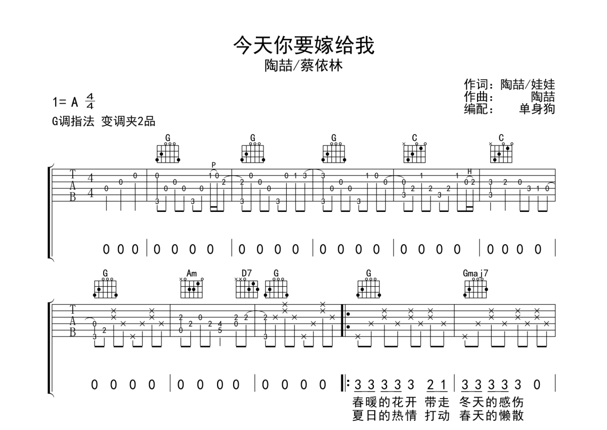 曲谱介绍: 陶喆/蔡依林《今天你要嫁给我》吉他弹唱谱,采用G调指法编配,单身狗编配出品,共有4张高清图谱。