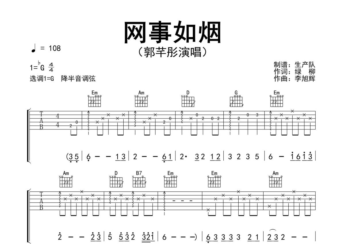 曲谱介绍: 郭芊彤《网事如烟》吉他弹唱谱,采用G调指法编配精编完美版,生产队编配出品,共有3张高清图谱。