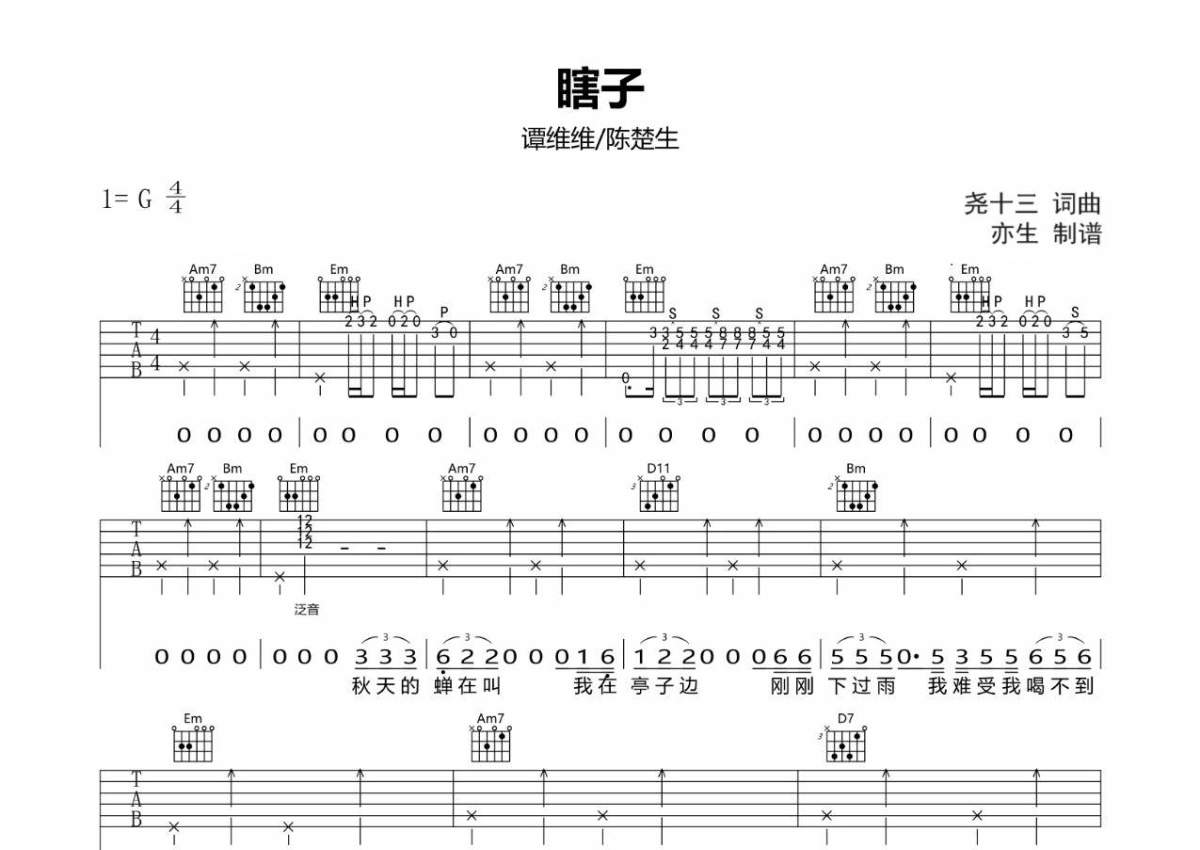 曲谱介绍: 陈楚生/谭维维《瞎子》吉他弹唱谱,采用G调指法编配,亦生编配出品,共有3张高清图谱。