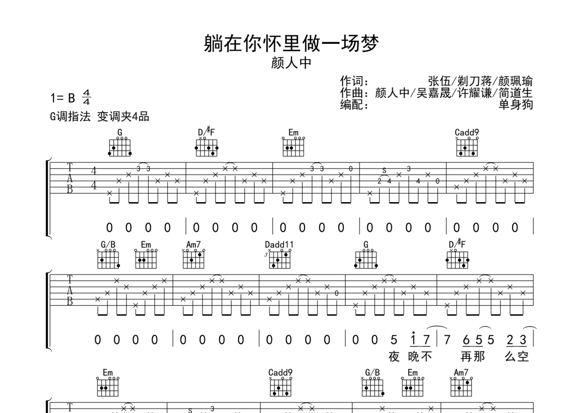 曲谱介绍: 颜人中《躺在你怀里做一场梦》吉他弹唱谱,采用G调指法编配,单身狗编配出品,共有3张高清图谱。