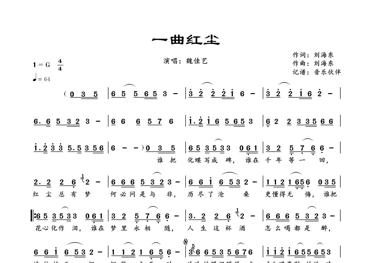曲谱介绍: 魏佳艺《一曲红尘》,音乐伙伴编配出品,共有1张高清图谱,免翻页排版设计。