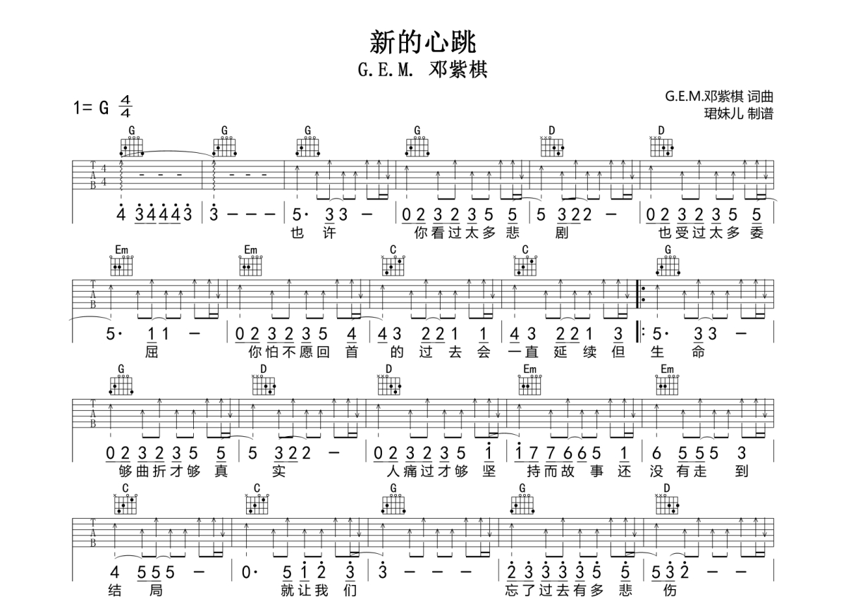 曲谱介绍: 邓紫棋《新的心跳》吉他弹唱谱,采用G调指法编配,珺妹儿编配出品,共有2张高清图谱,免翻页排版设计。