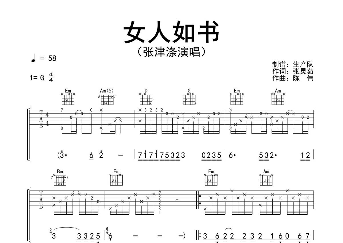 曲谱介绍: 张津涤《女人如书》吉他弹唱谱,采用G调指法编配精编完美版,生产队编配出品,共有3张高清图谱。