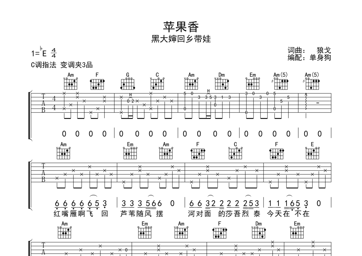曲谱介绍: 黑大婶回乡带娃《苹果香》吉他弹唱谱,采用C调指法编配,单身狗编配出品,共有3张高清图谱。