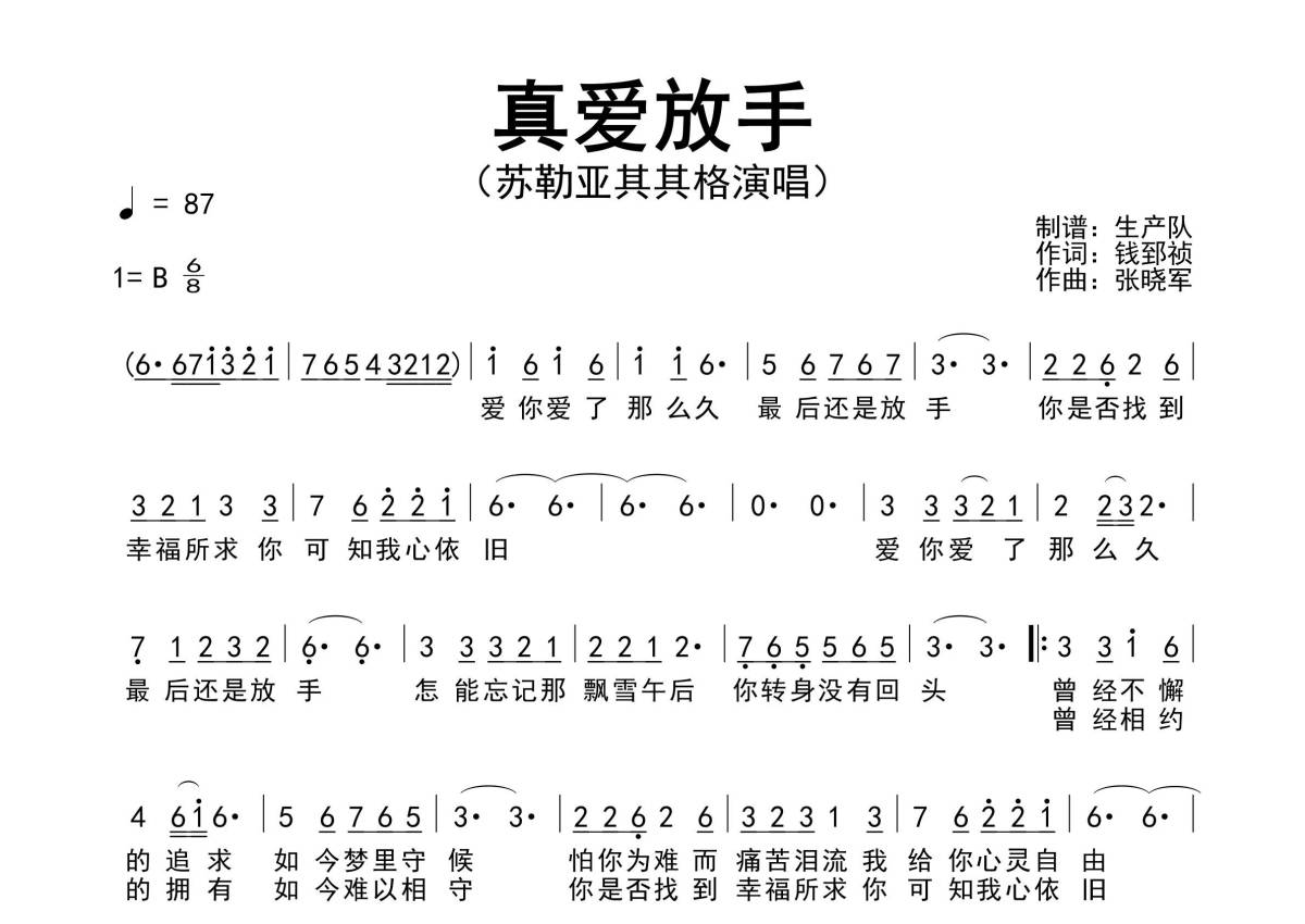 曲谱介绍: 苏勒亚其其格《真爱放手》原版简谱,生产队编配出品,共有1张高清图谱,免翻页排版设计。