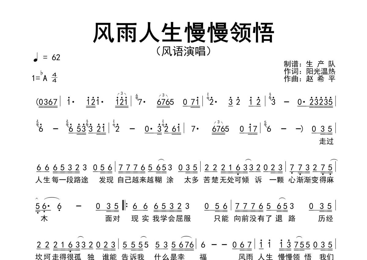 曲谱介绍: 风语《风雨人生慢慢领悟》原版简谱,生产队编配出品,共有1张高清图谱,免翻页排版设计。