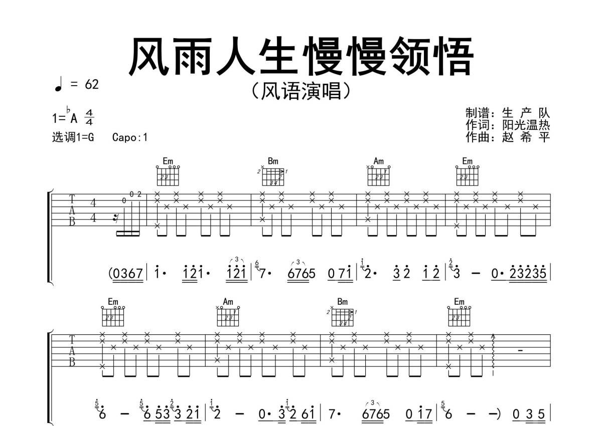 曲谱介绍: 风语《风雨人生慢慢领悟》吉他弹唱谱,采用G调指法编配精编完美版,生产队编配出品,共有3张高清图谱。