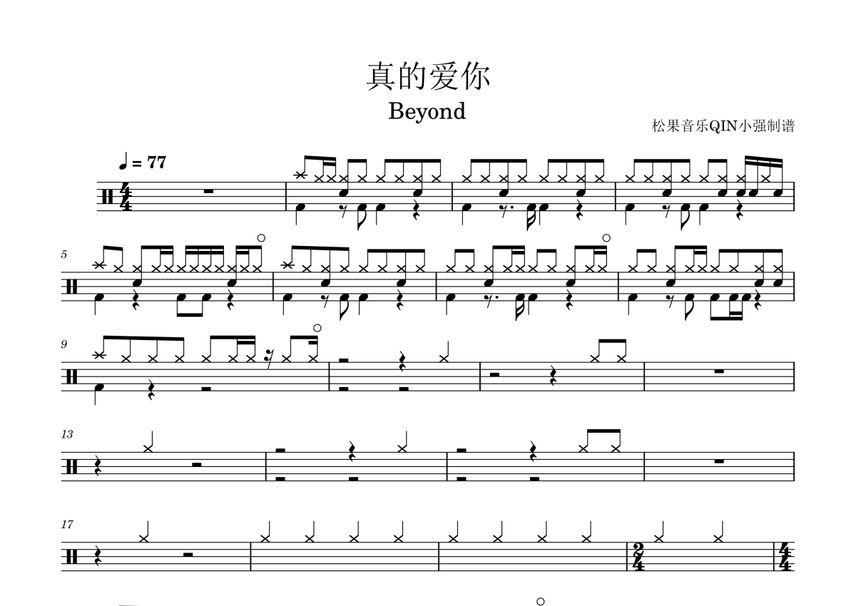 曲谱介绍: BEYOND《真的爱你》架子鼓谱,松果音乐QIN小强编配出品,共有3张高清图谱。